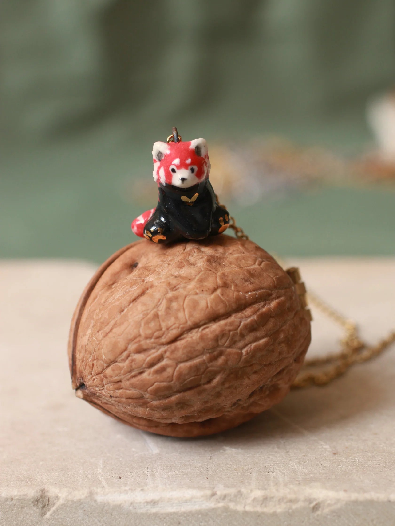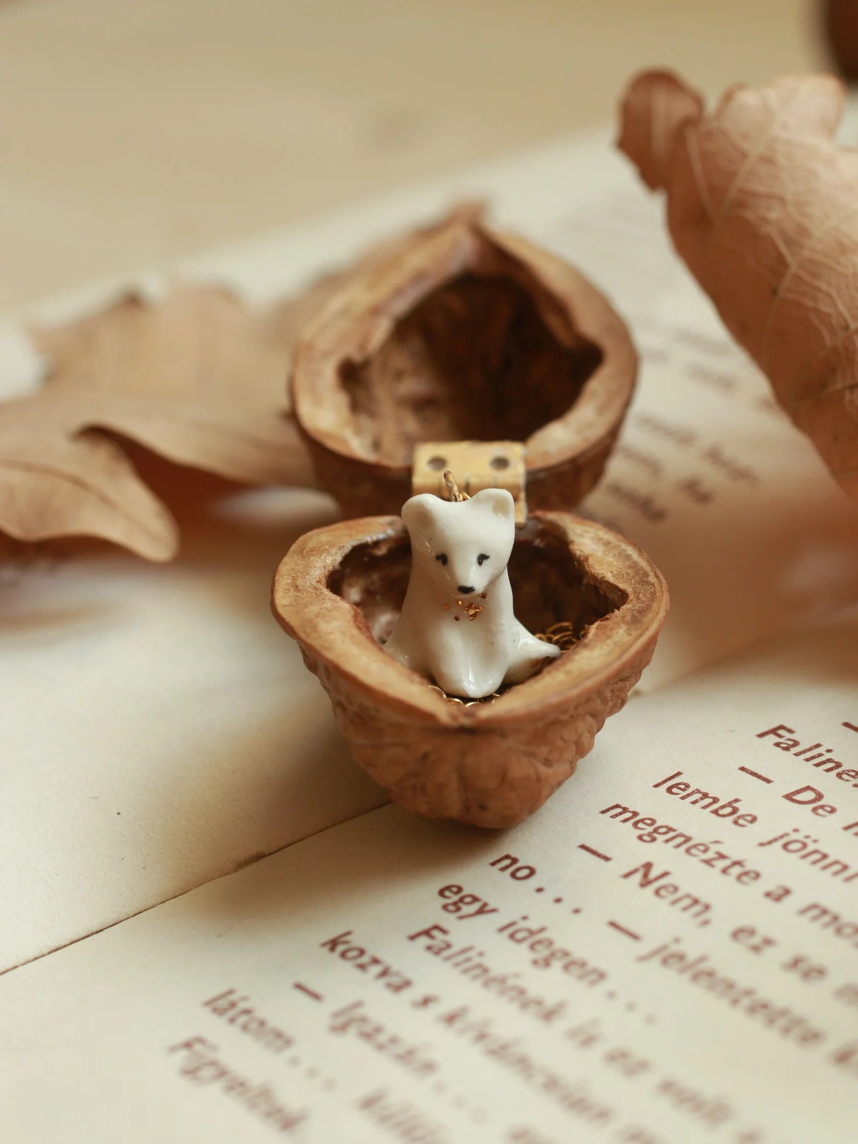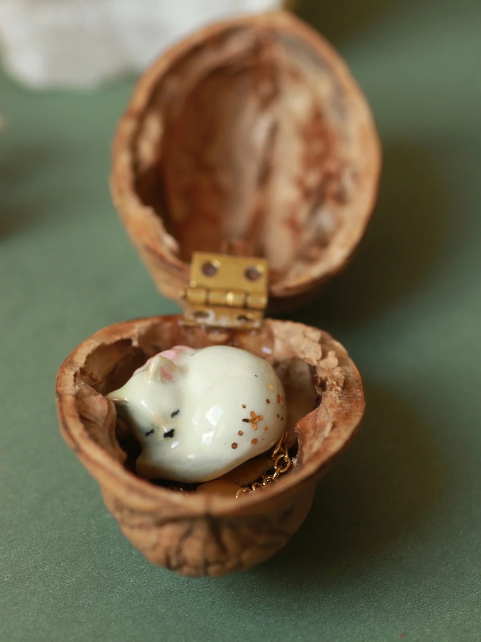 Delicately nestled inside a real walnut shell, this miniature world holds a hand-sculpted sleeping cat, painted and glazed with care. It's a piece of gentle wonder—part necklace, part keepsake.